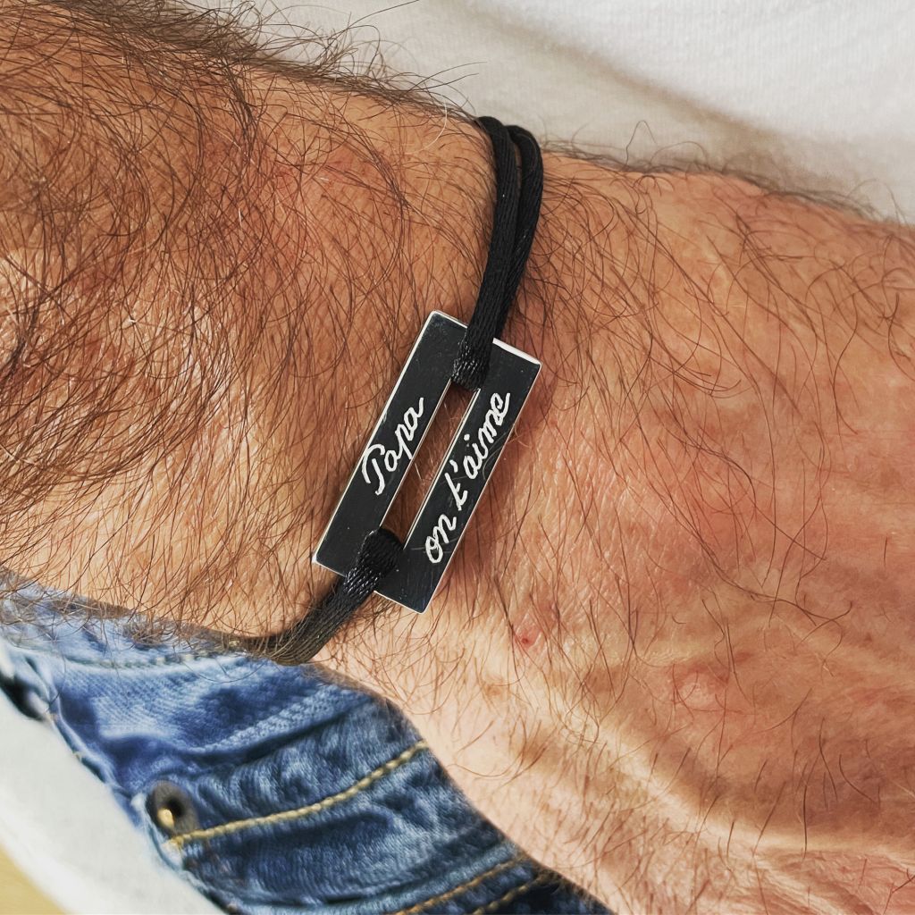 Bracelet plaque rectangulaire évidée 27 mm montée sur cordon. Je peux vous graver des prénoms au recto et une date au verso.