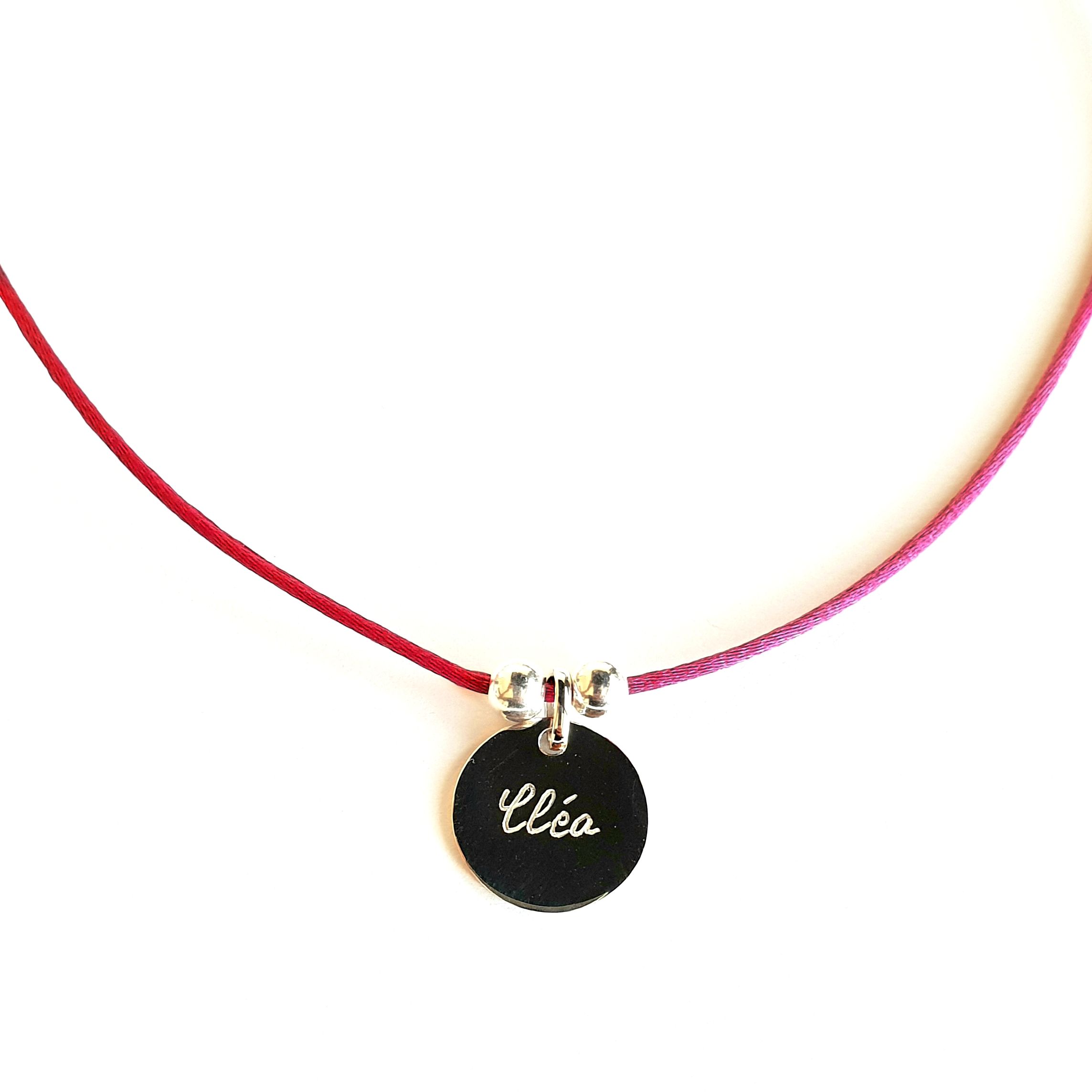 Collier médaille ronde 15 mm montée sur cordon. Je peux vous graver un prénom au recto et une date au verso.