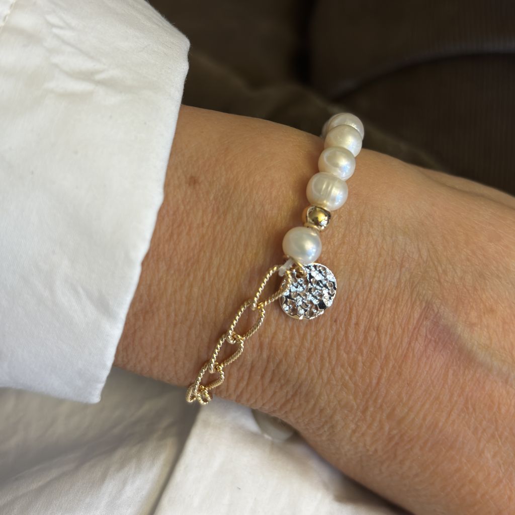 Bracelet médaille martelée 10 mm gravable au dos. Montage sur chaîne maillons ovales torsadés et perles de culture 7 mm avec fermoir ajustable